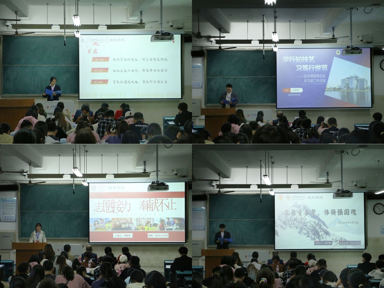 会上,张子杰与李文孝分别进行2023-2024学年工作总结汇报,他们从提升团学素养、强化部门建设、开展社会实践以及致力志愿服务等诸多方面对团学工作进行汇报与总结,期望未来团学工作能够稳步前行,再铸辉煌。宋子豪与韩紫怡分别进行公司团学2024-2025学年工作计划汇报,他们用心总结工作经验,强化思想建设,对团学工作予以全面规划和展望。第66届团学各部门负责人依次进行上学年工作总结,系统地阐述了各部门上一学年的工作情况,并对工作中出现的问题积极反思,以确保未来各项团学工作稳步开展。