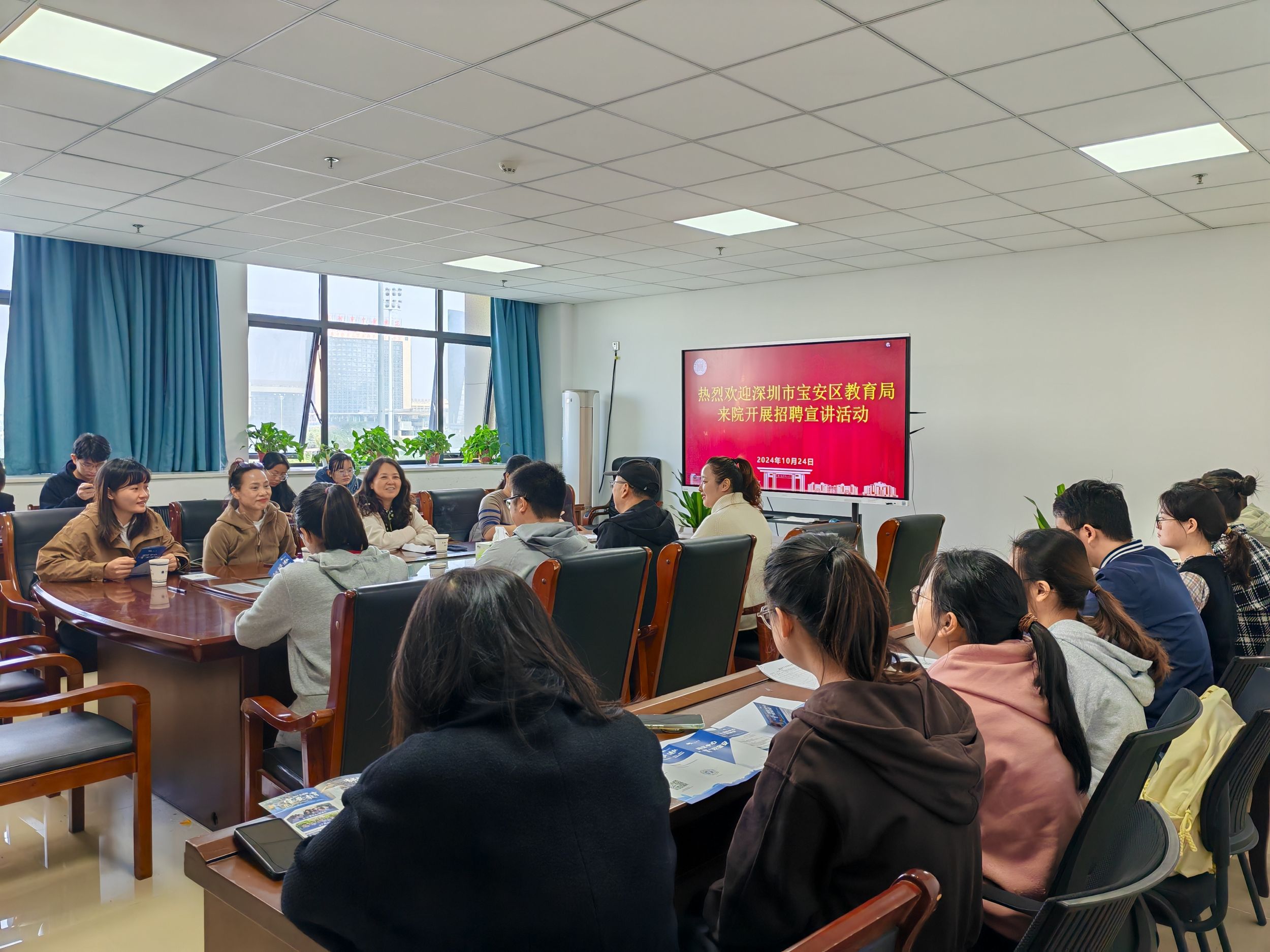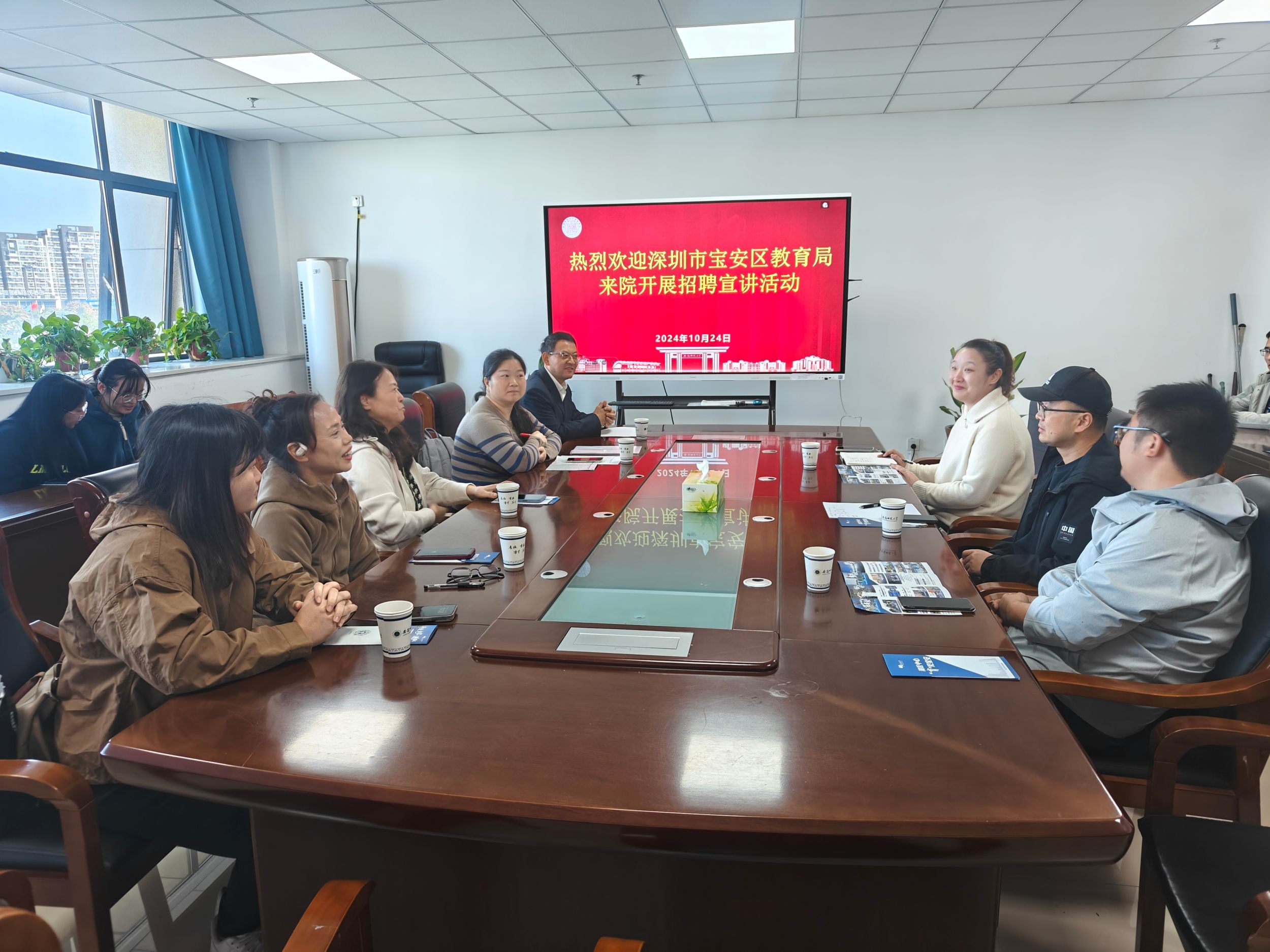 10月24日上午,深圳市宝安区教育局教师招聘工作组在李唯董事长的带领下,莅临英国上市公司365举办教师招聘宣讲座谈会。宣讲会由公司党委副书记宫超主持,校招就处副处长刘振杰、宝安区教师招聘工作组、辅导员吕永鑫、韩雪、胡文新及公司2025届部分毕业生参加。