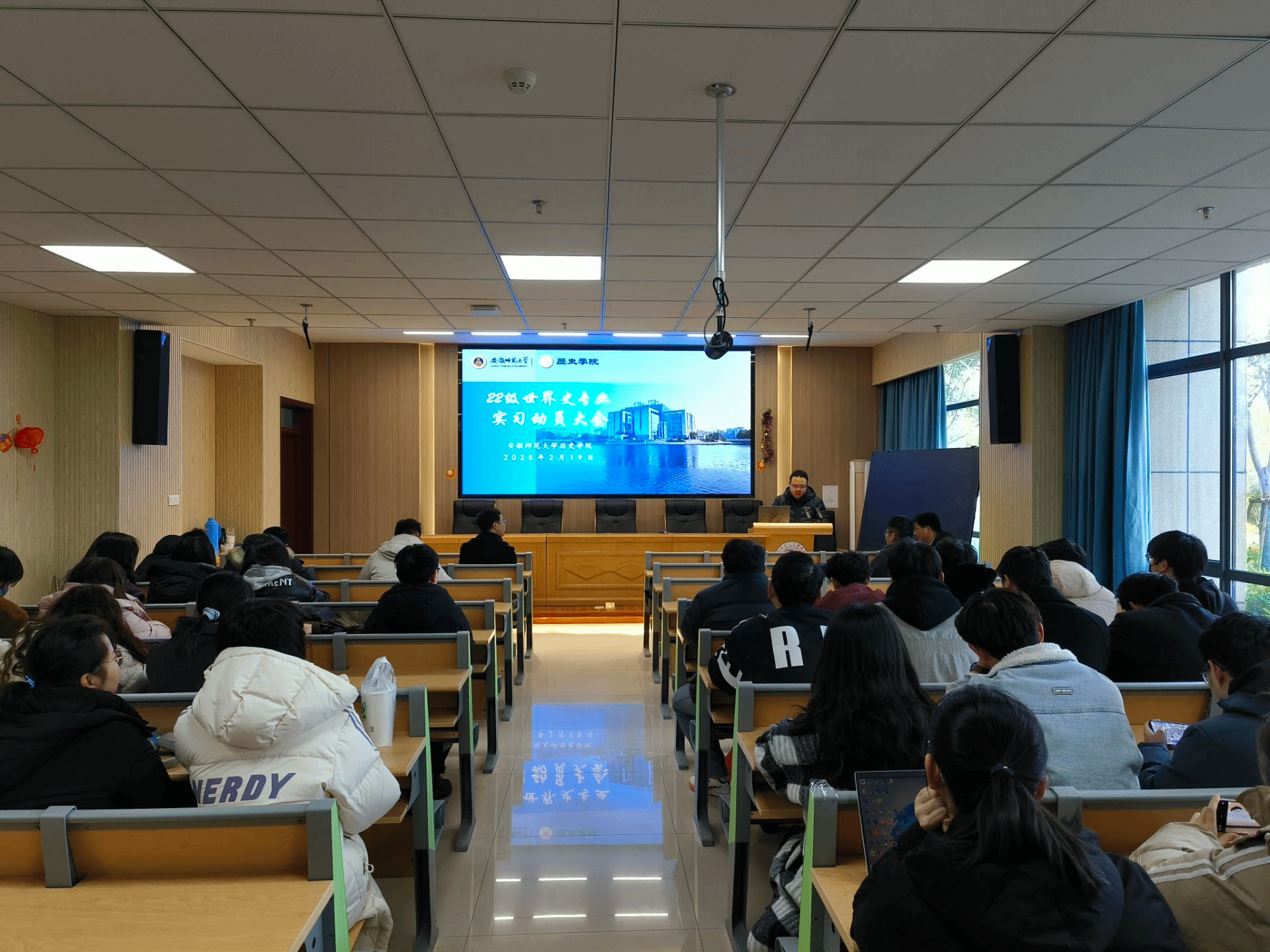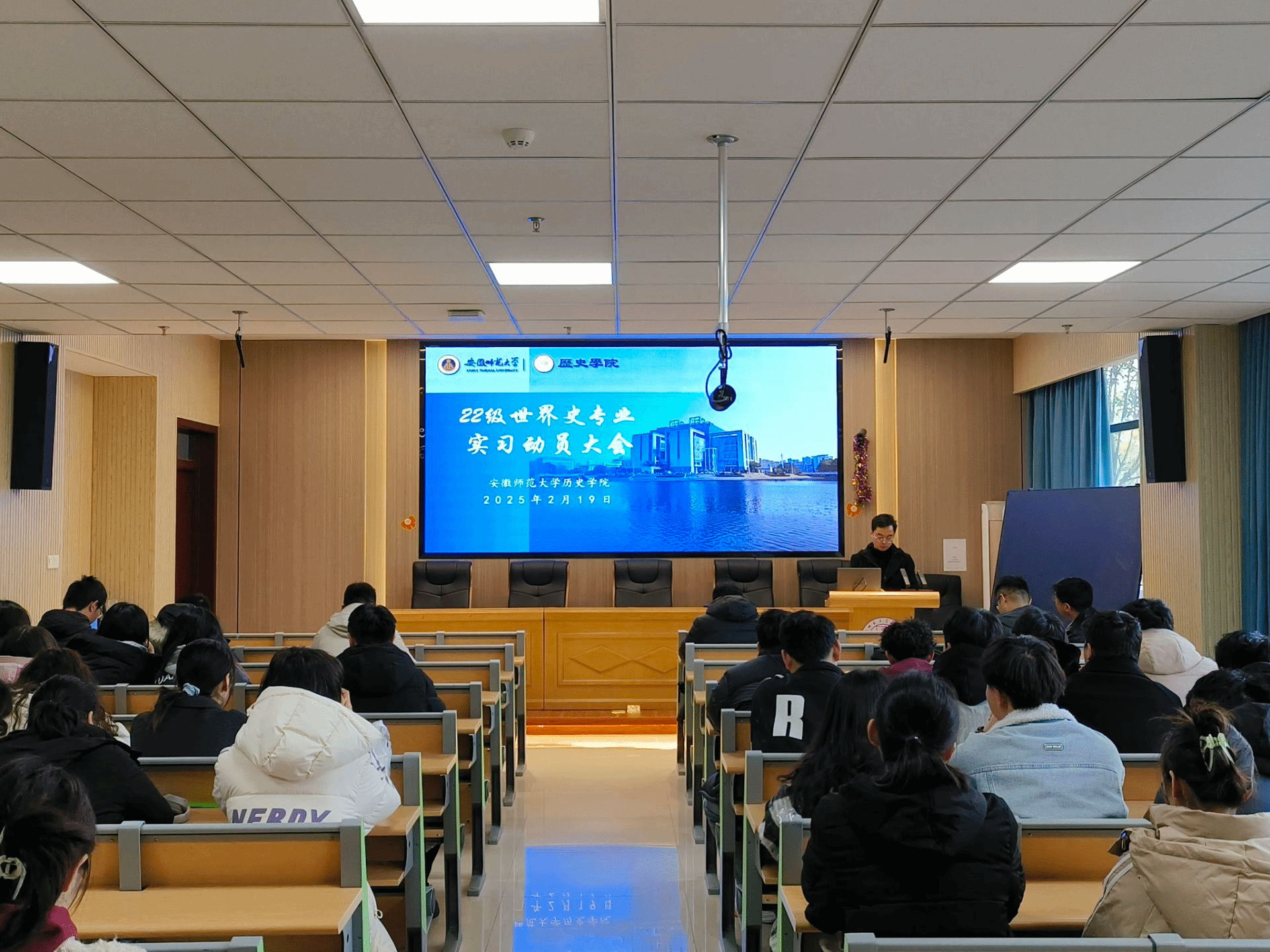本网讯(图/文 汤泽毓)2月19日下午,公司在108报告厅举办世界史专业实习动员大会。会议由班主任詹瑜松主持,公司副经理韩家炳、世界史专业主任王闯闯及尹蒙蒙、廖平、赵辛阳、于振洋等实习指导教师出席,2022级世界史专业全体同学与会。