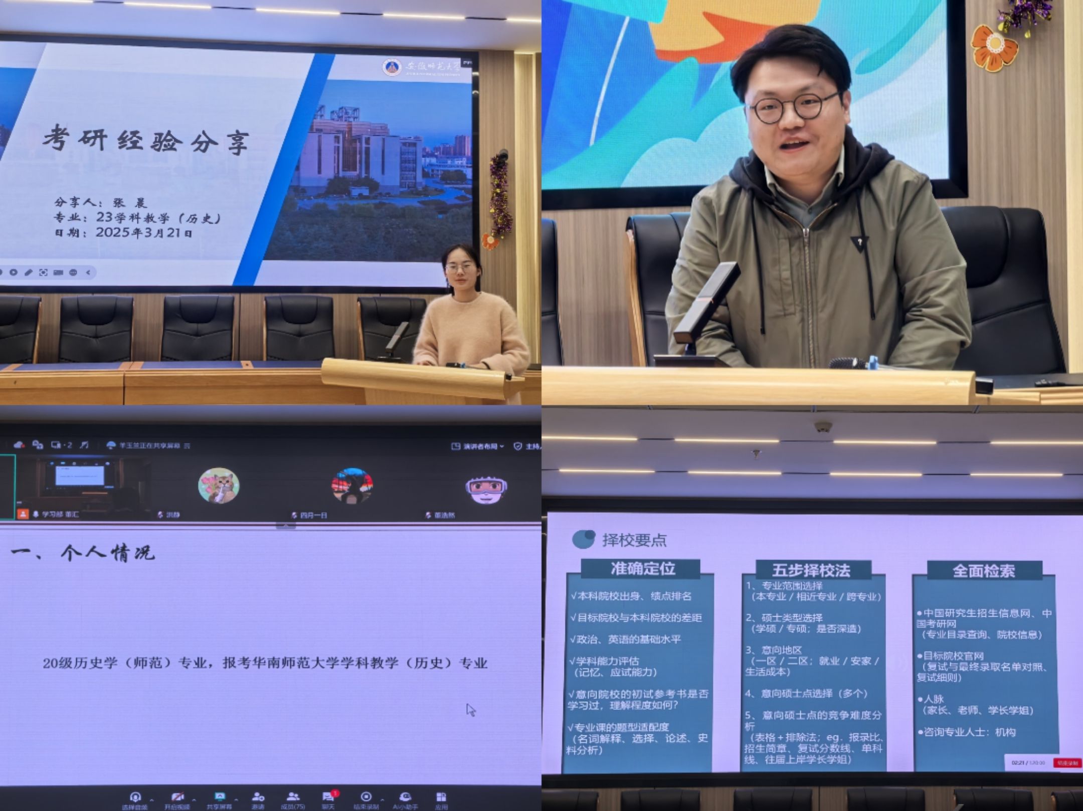 会议安排经验分享、互动问答和教师指导三个环节,邀请华南师范大学2024级学科教学(历史)研究生羊玉兰、华中师范大学2024级中国史研究生徐京以及公司2023级学科教学(历史)研究生张晨、2024级中国史研究生王甫松等4位优秀的往届毕业生进行经验分享。他们从备考策略、院校选择、时间管理、备考心理等各个方面分享经验。他们特别指出,合理规划备考周期、建立知识体系、保持良好心态是成功的关键,并现场解答了学弟学妹关于复习方法、资料选择等疑问。
