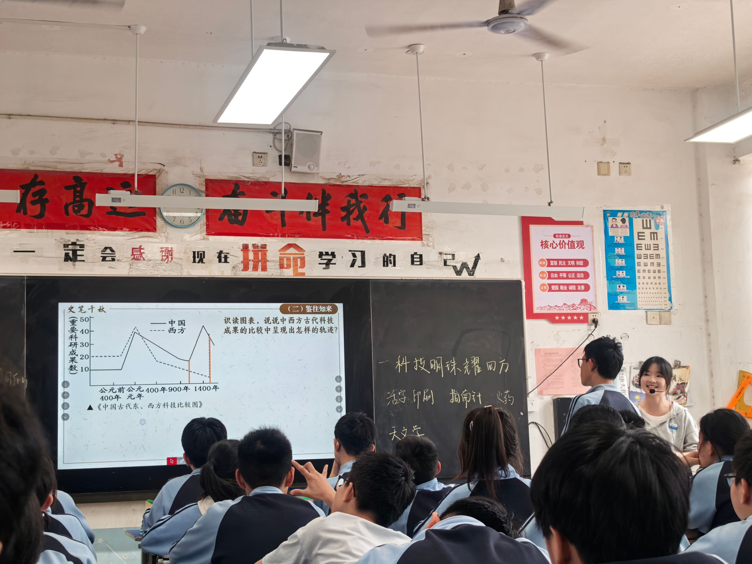 在含山县第三中学,董事长唐守宝介绍了实习小组的总体情况,高度评价了实习同学吃苦耐劳、勤问好学、认真扎实的实习风貌。实习生安紫涵讲授公开课“辽宋夏金元时期的科技与文化”,她利用制作精美的PPT、直观性的数据深入浅出的为同学们讲解了宋元时期的科技成就,整个课堂气氛活跃,效果良好。评课环节中,指导老师们对安紫涵的授课给予了高度评价,同时就板书、课程节奏、课堂互动等环节也提出了完善的意见和建议。