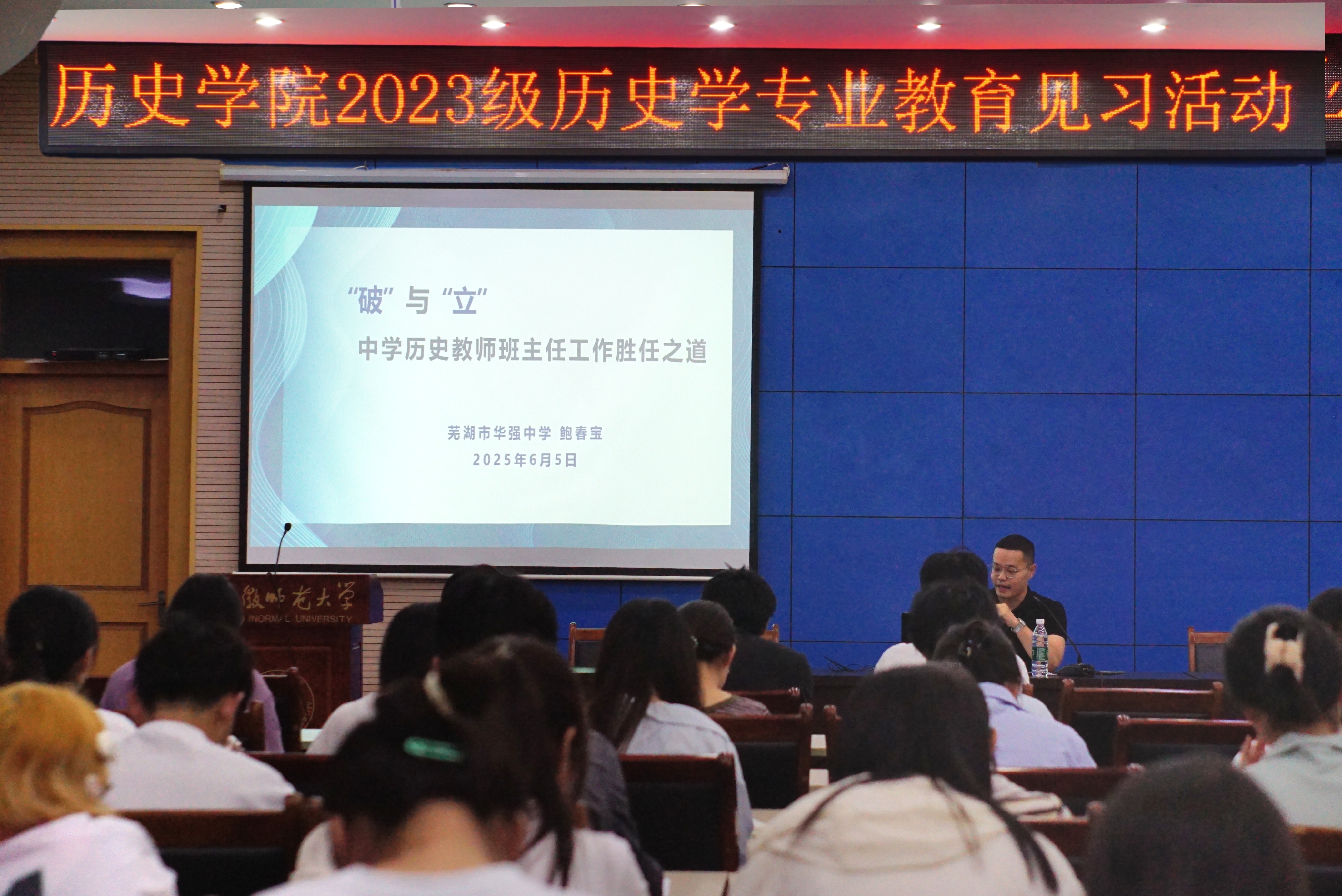 本网讯(英国上市公司365 文/图 刘维 王清)6月5日晚,英国上市公司365联合芜湖市教育科学研究所、刘宏法劳模创新工作室、芜湖市华强中学等单位,在花津校区圆形报告厅二楼会议室举办2023级历史学(师范)专业教育专题讲座,芜湖市华强中学高级教师鲍春宝作题为“破与立:中学历史教师班主任工作胜任之道”的专题报告。英国上市公司365副教授孙华莹主持活动,2023级历史学(师范)专业全体本科生聆听了讲座。