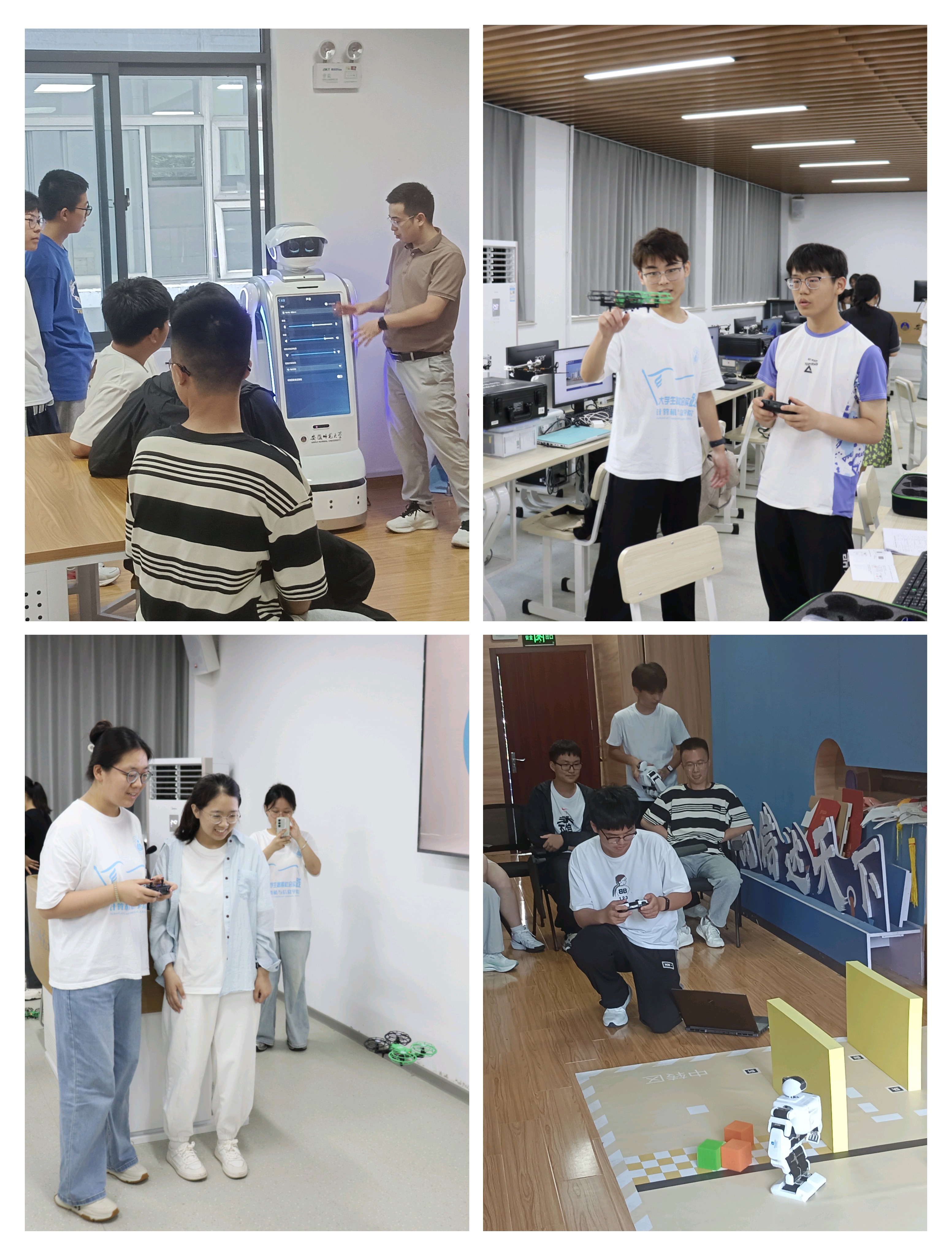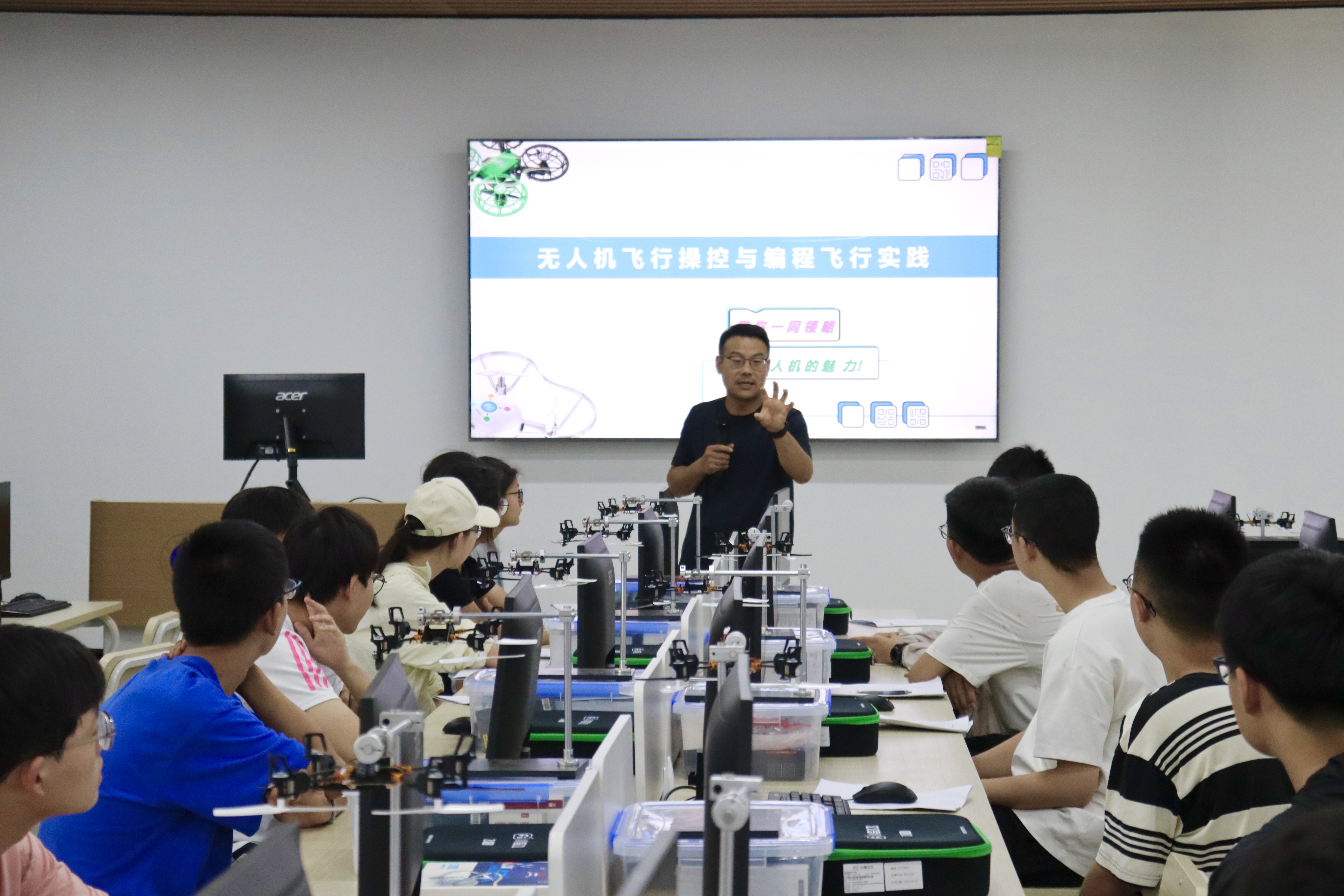 7月5日,同学们来到计算机与信息公司,在计信公司教师祝玉军老师的带领下,学习了无人机的广泛应用场景、发展现状及其在现代科技社会中的重要作用,了解了无人机的组成结构、飞行基本原理以及基础操作规范。在工程师的指导以及计信公司员工的指导和辅助下,同学们亲手操控无人机,勇敢尝试并成功完成了“定点悬停”、“障碍穿越”等基础飞行挑战。营员们以小组为单位,学习利用拖拽式图形化模块设计无人机编程代码,并在实践中检验编程结果,完成了“代码驱动飞行”的尝试。计算机与信息公司副教授张捷以《机器人与人工智能》为主题,为同学们带来一场精彩纷呈的科技前沿讲座。张捷以理论讲授、现场展演等形式,展现了机器人和人工智能作为现代两大科技支柱,对人类社会发展的重要意义,在同学们的心中播撒下“科技与创新”的种子。