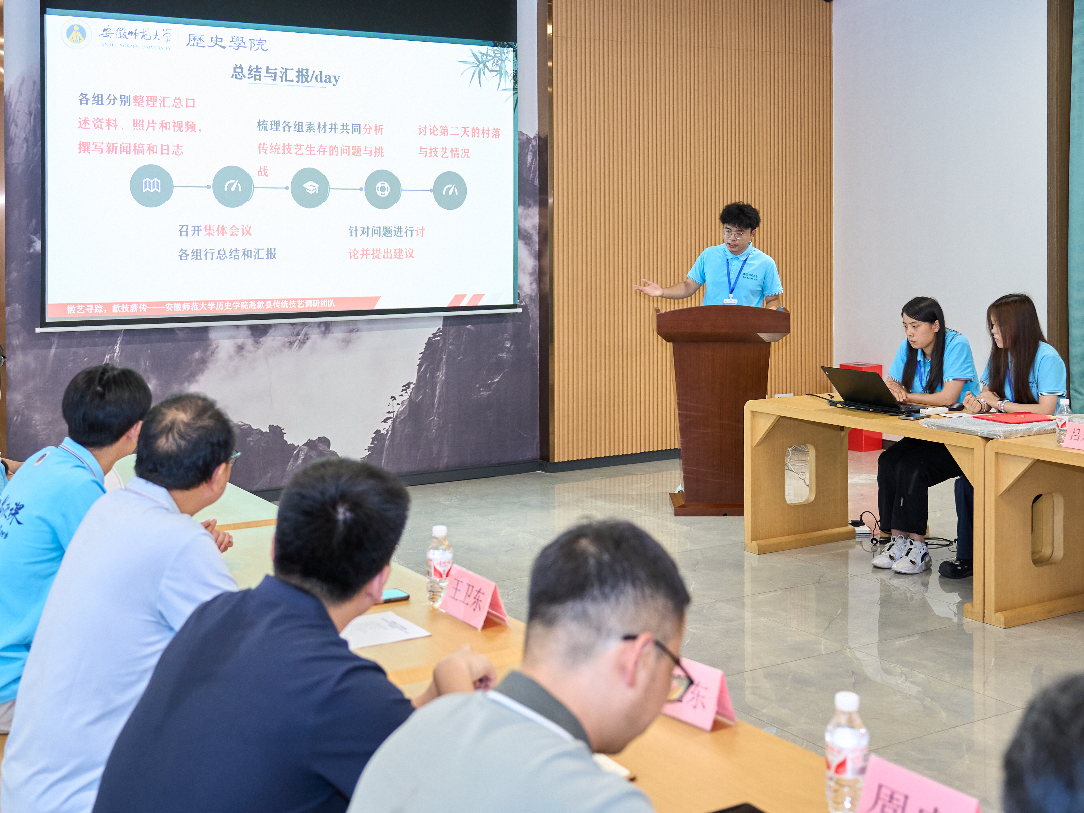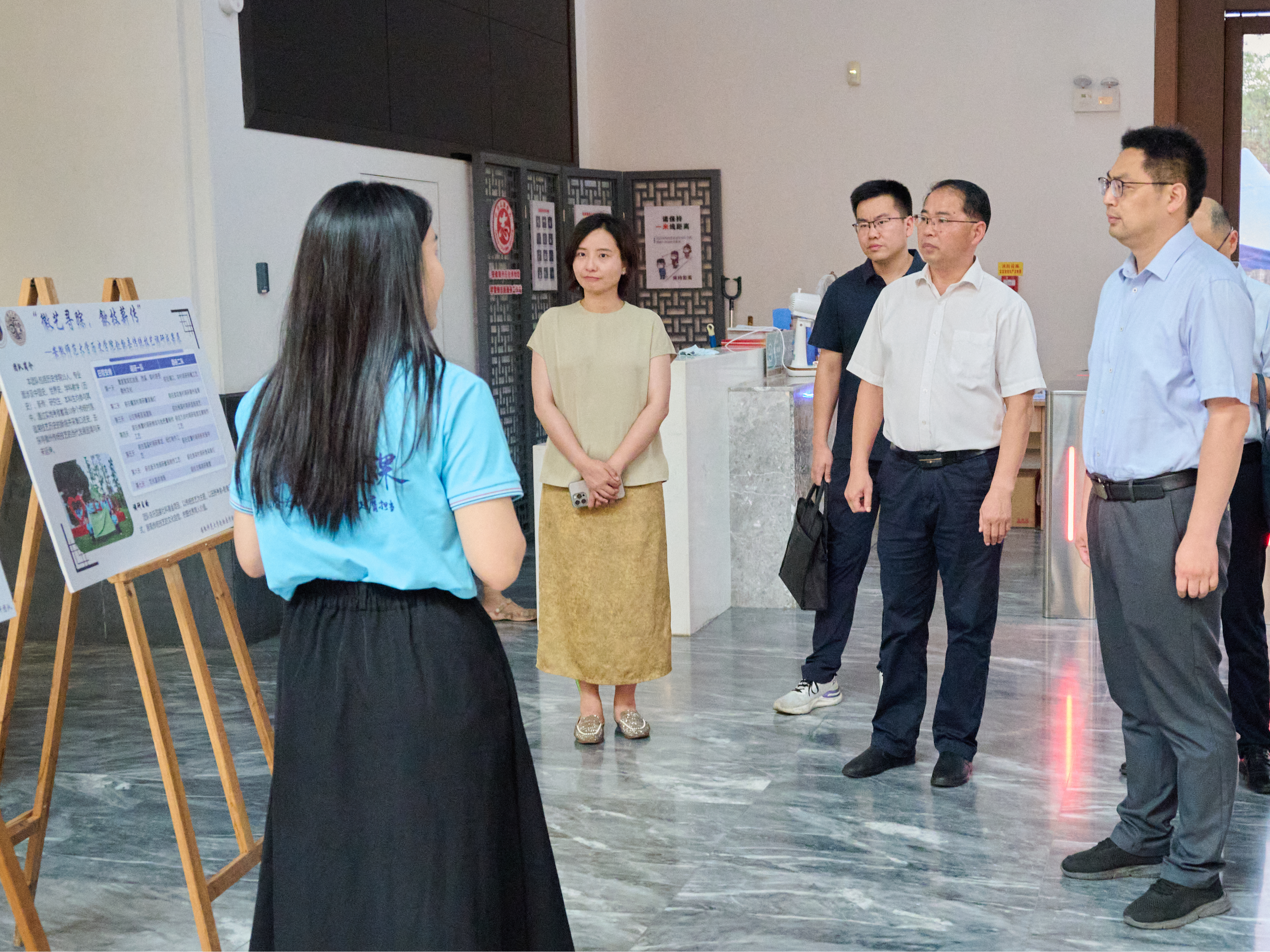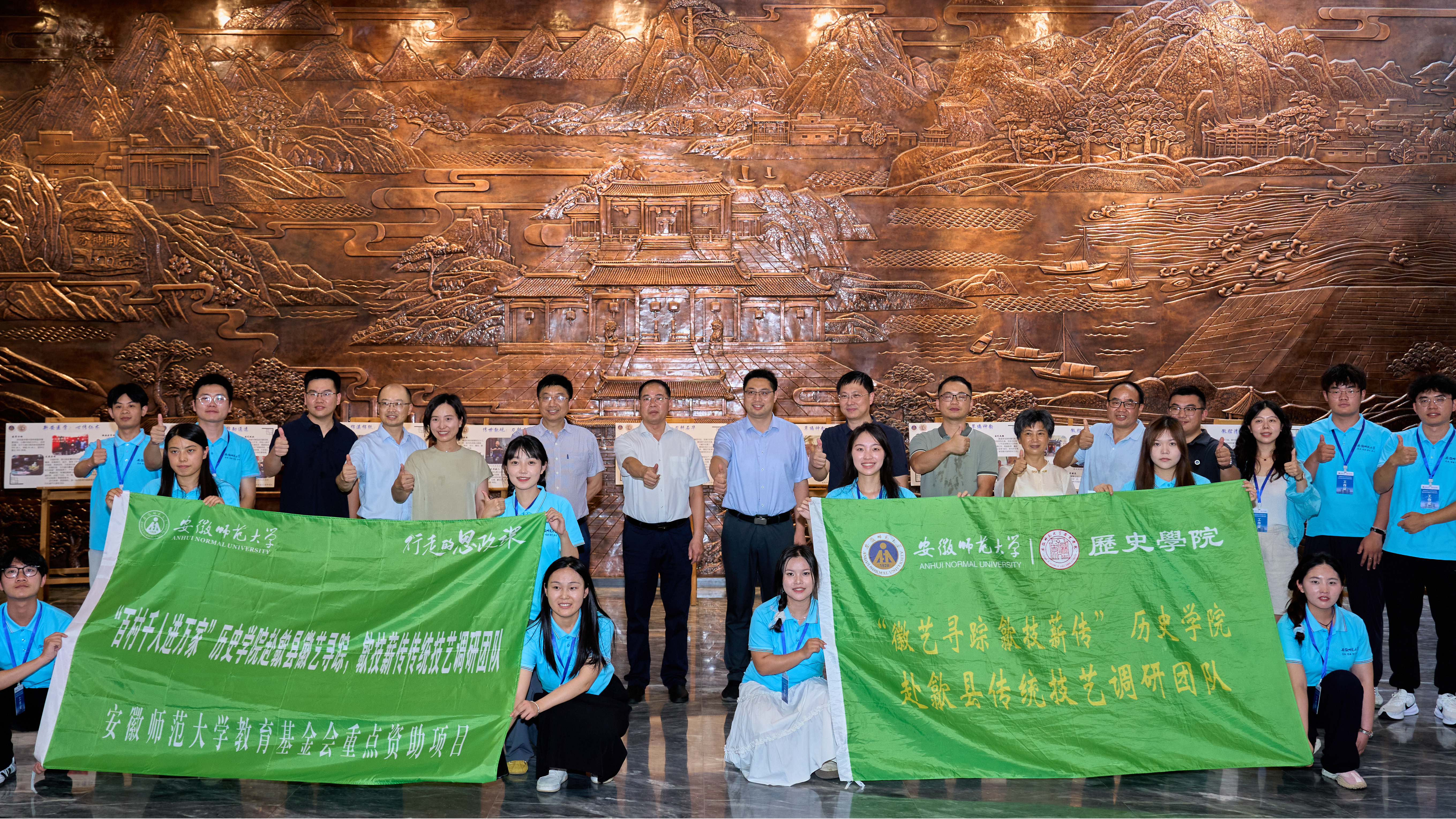在安徽徽州历史博物馆,调研组一行参观了团队举办的 “歙县传统技艺调研成果展”,在实践队员的细致讲解下,认真观看展板内容,倾听队员对各类传统技艺历史与现状的介绍,详细询问传统技艺的传承情况,并鼓励同学们在实践中深刻领会历史文化传承与创新的重要意义。