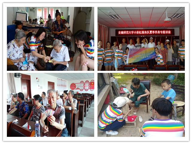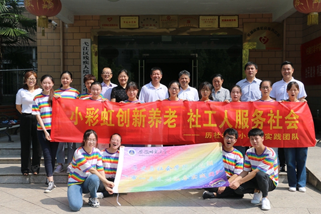 小彩虹创意养老,社工人服务社会。小彩虹养老服务实践团队是由公司2016级和2017级本科生组建起来的一支暑期社会实践团队,是2015级社会工作专业李茜乐带领的“小彩虹创意社区养老工作室创业项目”一次真正的落地实践。团队成员25人,分别奔赴芜湖市弋江区弋江嘉园社区及芜湖县湾沚镇前进社区开展养老服务活动。在实践的7天里,累计服务老人数105人,开展活动11次,入户探访老人数6人,开展深度访谈9次。