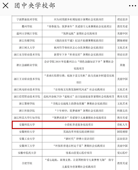 本网讯(16社会工作 叶露露)11月16日,团中央公司部发布2018年全国大中专员工“三下乡”社会实践“千校千项”成果遴选结果。经过筛选、投票、专家评审等环节,公司小彩虹养老服务实践项目表现突出,在来自全国1300余所高校的7600余份优秀实践案例申报作品中崭露头角,摘得“最具影响好项目”殊荣。