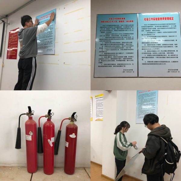 本网讯(历社公司 许云云 梁任坤) 根据校【2018】9号文《关于2018年下半年实验室安全检查整体安排的通知》的要求,为加强实验室安全管理工作,预防和减少安全事故,确保教学、科研工作有序、规范、安全开展,公司院成立了以经理为组长的实验室安全检查专项小组,并于10月30日对公司所属社会工作实验室与公共事业管理实验室开展实地巡查,并重点对实验室场所的消防器材和内部的电路进行隐患排查。