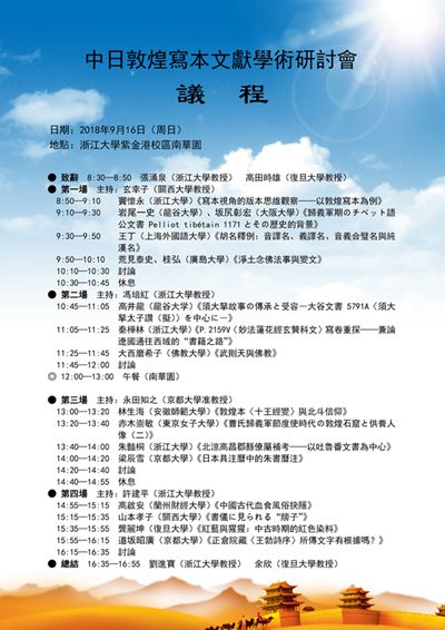 本网讯(历史与社会公司)2018年9月15日——16日,由浙江大学、京都大学与浙江省敦煌学与丝绸之路研究会等单位主办,浙江大学人文公司承办的“中日敦煌写本文献学术研讨会”在浙江大学紫金港校区南华园举行。来自日本京都大学、关西大学、龙谷大学、大阪大学、广岛大学、佛教大学、东京女子大学、东洋大学、大手前大学与中国浙江大学、复旦大学、上海外国语大学、兰州财经大学、英国正版365官方网站等20余名中外学者以及部分浙江大学访问学者、博士后研究员、研究生等参加了本次学术研讨会。