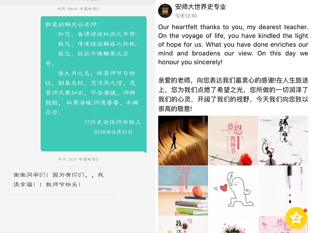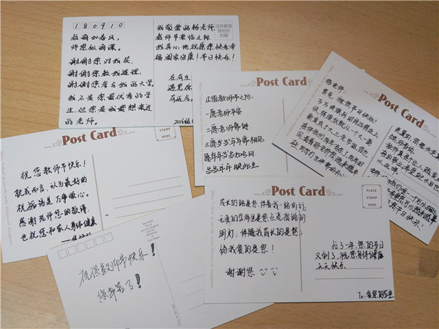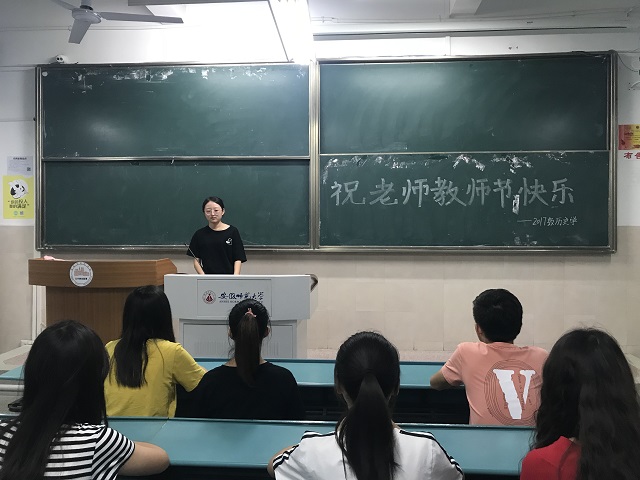 在教师节之前,各班积极准备教师节贺卡、自制便签等小礼物,向老师们表达祝福,一张窄窄的贺卡,书不尽情深意长。此外,各班同学还用微信、微博、QQ等自媒体写一段真情寄语给自己敬爱的老师,通过指间将祝福和感恩传送出去。在祝福中,同学们自己也受到了教育,历史学郑宇航同学说:“通过教师节的感恩学习和对老师表达敬意,让我深深地感受到了师恩的伟大,感受到作为一名教师的光荣,将来我也要向老师们一样,当一名甘愿燃烧自己、照亮他人的人民教师”。