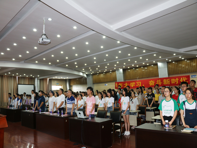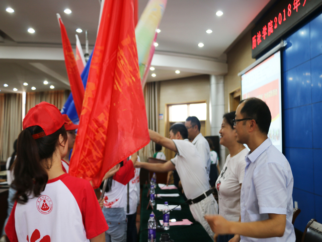 2018年校重点团队负责人张文逸代表本次暑期社会实践志愿者发言表示,作为新时代老员工我们有责任和义务学以致用回馈社会,勇担服务社会,奉献社会的责任,为自己人生拓宽视野,为国家社会的发展贡献自己的一份力。实现自身价值,在无私奉献中砥砺品格,塑造新时代老员工形象。发言结束后,领导老师们为各暑期社会实践团队授旗。