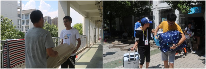 7月15日当天,天气炎热,公司在31栋、45栋楼下分别设立服务点,准备了矿泉水、医药箱,及时应对突发状况。公司抽调员工党员、员工骨干组成“搬迁志愿服务队”,男生负责物品搬运,女生负责物品看管,搬迁秩序井然。在新宿舍中,公司为每位同学准备了“入住大礼包”内含矿泉水、洗衣液以及温馨的问候语,让每位新入住的同学“解解渴、洗洗衣、暖暖心”。2017级社会工作的肖凯说“虽然宿舍搬迁比较累,但看到公司为我们考虑的这么细致,而且老师们和我一起抗包、拿东西,心里特别暖,表白我大历社!”
