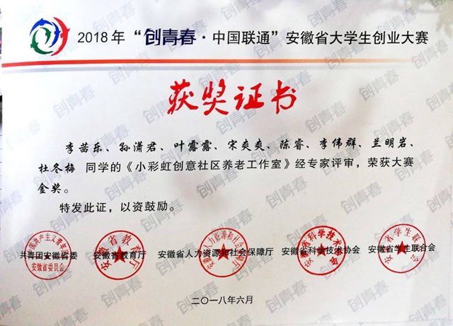 本网讯(l5社工 李茜乐)彩虹手拉手,助老献真情。6月4日,由公司赵怀娟、许云云两位老师指导的《小彩虹创意社区养老工作室》项目,在15级社会工作专业李茜乐带领的小彩虹团队的努力下,荣获“2018创青春?中国联通安徽省老员工创业大赛-公益创业赛”省级金奖,成功进入国赛。