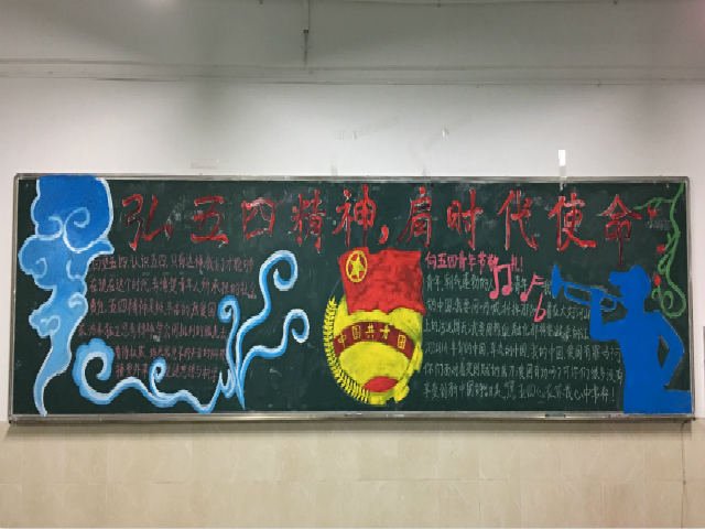 为进一步弘扬五四精神,在广大师生中形成学习五四精神的良好风气,院团委组织公司各团支部开展多种形式的主题团日活动。各团支部在辅导员的指导下开展主题班会、五四运动知识竞赛、辩论赛等形式多样的活动,使得每位团员都能够参与到主题教育当中,感受磅礴青春正能量。并组织同学在固定教室策划推出“五四青年节”主题黑板报,认真组织同学们学习五四精神。通过多种形式的宣传活动,同学们深化了对五四精神的理解,并在公司内掀起了一场学习五四精神的浪潮。