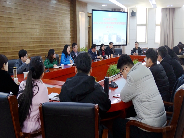 本网讯(院员工会 兰 锦 洪 星)为及时准确地了解新学期公司员工的思想动态,研究解决员工在思想、学习和生活方面存在的实际突出问题,3月21日下午14点,公司于圆形报告厅第一会议厅成功举办了2017-2018学年新学期员工思想情况调研会。公司党委副书记胡悦超、副经理赵怀娟、专业负责人安建增、丁修真、路幸福、韩家炳以及社工专业老师柴文杰,院团委书记宫超、教学办孙黎丽、阮丽丽,各年级辅导员以及各班员工代表参加本次座谈会。会议由胡悦超副书记主持。
