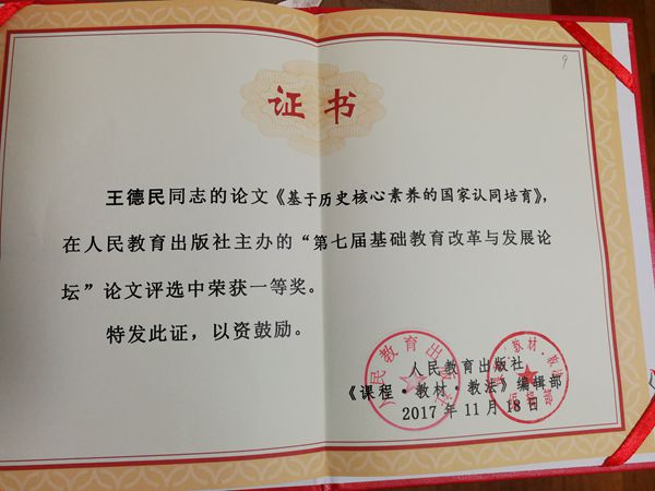 人民教育出版社党委书记、《课程?教材?教法》主编郭戈、厦门教育局局长郭献文分别致辞,尝试教学理论研究会理事长邱学华、厦门教科院经理林伟庆、福建师大教育公司经理余文森等分别做了“中国基础教育的理论缺失与对策”、“多元适宜教育的理论与实践探索”、“论学科核心素养形成的机制”等报告。公司王德民教授参与了“学科课程教材与学科核心素养融合研究”分论坛讨论,其论文《基于历史核心素养的国家认同培育》获参会论文一等奖(大会共收到参会论文300多篇,一等奖约20篇)。