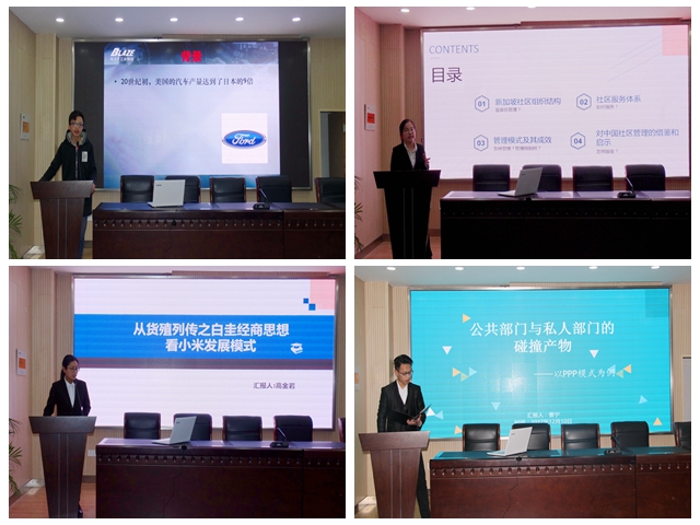 本次比赛采取六分钟限时ppt讲演形式,选手自选国内外政府、企业或社会机构优秀管理模式作为典型案例进行研究分析,评委老师将从其版面设计、汇报内容与现场表现综合考量。12位选手皆表现出彩,以沉着自信的面貌对自己研究的案例主题进行专业性解读,并就其优劣势展开具体分析,抒发自己的反思与启示:小米的货殖列传白圭经商思想,利用独特的产品定位和特色营销得到了众多“米粉”,在眼花缭乱的电子产品中脱颖而出;三只松鼠以呆萌的logo、健康的文化、细心的服务在众多干果产品中赢得了消费者的喜爱;以谢馥春为例的国货化妆品通过线上线下联动定制价格策略,成功打造出国际化妆品牌,站上国际舞台。除此之外,16级公管同学曹宁,以独特的视角向大家介绍了当代新型的管理模式PPP,通过私人与政府合作建立伙伴关系,实现利益共享、风险共担,成功的管理模式已广泛应用于各城市项目建设并取得卓越成效;刘梦瑶同学以新加坡人本化的社区管理为切入点,结合精美的ppt细致条理的讲解新加坡以统一指导与民主自治并行为原则的社区管理模式,其社区管理的潜政治化、非经济化和非强制化理念作为成功典范也同时为我国管理模式提供了可行性建议。各参赛选手的优异表现获得评委老师的充分肯定。
