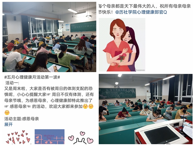 契合5月12日母亲节节日特点与5月25日节日含义,学院开展关于“关爱自己、关爱他人”的主题活动,分别为“感恩母爱”大声说和“自我关怀”知多少两种形式。