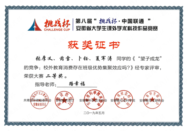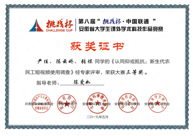 本网讯(历社公司)5月25日至27日,由共青团安徽省委员会、安徽省教育厅、安徽省科学技术协会、安徽省员工联合会共同主办的第八届“挑战杯”安徽省老员工课外学术科技作品竞赛终审决赛在合肥工业大学举行。我院路幸福老师指导张厚义等同学撰写的作品《“望子成龙”的竞争:校外教育消费存在班级优势集聚效应吗》获二等奖,陈爱如老师指导严佳等同学撰写的作品《认同抑或抵抗:新生代农民工短视频使用调查》获三等奖。