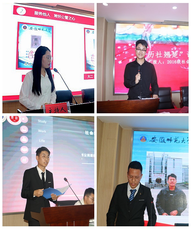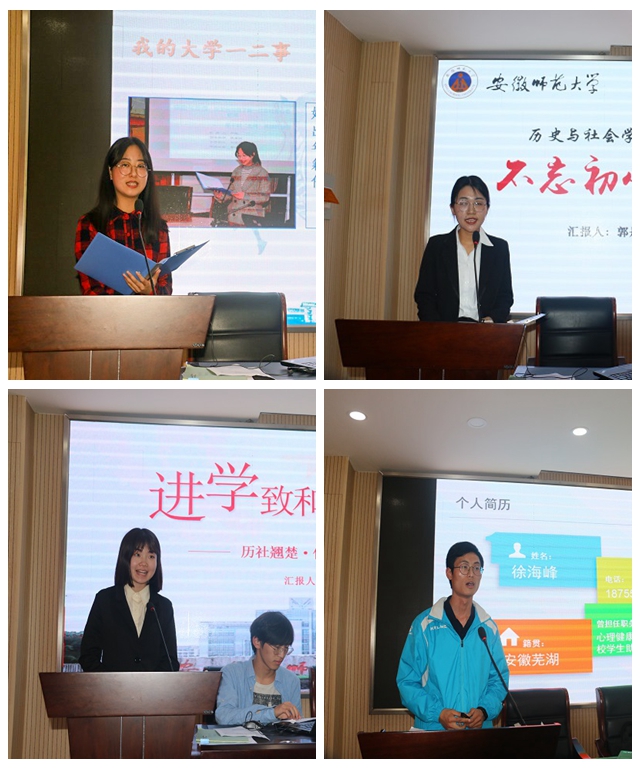 汇报会上,25位优秀学子依次登台汇报。他们用精心制作的PPT,向大家分享了个人大学期间在专业学习、社会实践、志愿服务、自立自强等方面的经历以及取得的成绩。2015级公管专业的巩星利同学以专业学习为主线,介绍了大学四年来在专业学习、社会实践、参与公司管理服务等方面取得的骄人成绩;2016级社会工作梁鑫同学分享了作为一名贫困生自立自强的不屈历程,他在为公司员工文艺活动作出贡献的同时,学习与实践两不误,取得了较好成绩;2017级世界史陈旭同学抱着向优秀学长学姐们学习的态度,分享了自己入校以来的成长经历,感叹:成功的道路虽然艰辛,但充满了喜悦……同学们的汇报或慷慨激昂振奋人心、或娓娓道来催人泪下,现场不时响起阵阵掌声。
