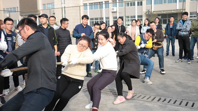 本次研究生趣味运动会集趣味性、合作性和竞技性于一体,包括“情投意合”、“极速传能”、“穿越前线”、拔河比赛四个项目。首先进行的是“情投意合”,公司选手两两配合,采用背夹球的方式,从划定区域的一点跑至另一点,考验了选手的团队协作能力。接下来是“极速传能”,在裁判员一声令下,选手们在垫着排球的同时迅速绕过障碍物,以最快的速度向终点进发。紧接着进行的是“穿越前线”,选手们灵活而又迅速地穿越过障碍。最后的拔河比赛将整场活动推向了高潮,公司选手信心满满,在场外观众的呐喊助威声中,同美术公司的同学一起以二比零的绝对优势赢得了拔河比赛的一等奖。