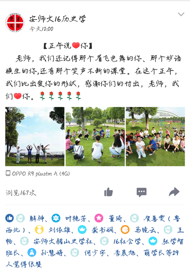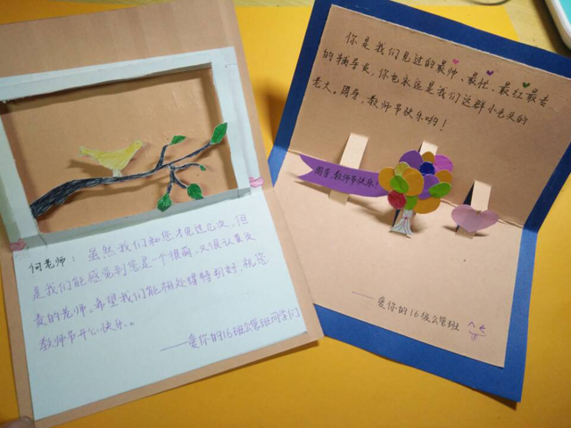 在教师节之前,各班积极准备教师节贺卡和小礼物,向老师们传达祝福,礼物虽轻,但蕴含着道不尽的感谢。线上活动开展的同时,线下活动也如火如荼地进行着。公司各班级鼓励同学们用微信、微博、QQ等自媒体写一段真情寄语给自己的恩师,通过指间将祝福和感恩传送给老师,让历社学子在浓浓的教师节氛围中,感受到最好的感恩教育,将尊师重道精神更好地传颂下去。