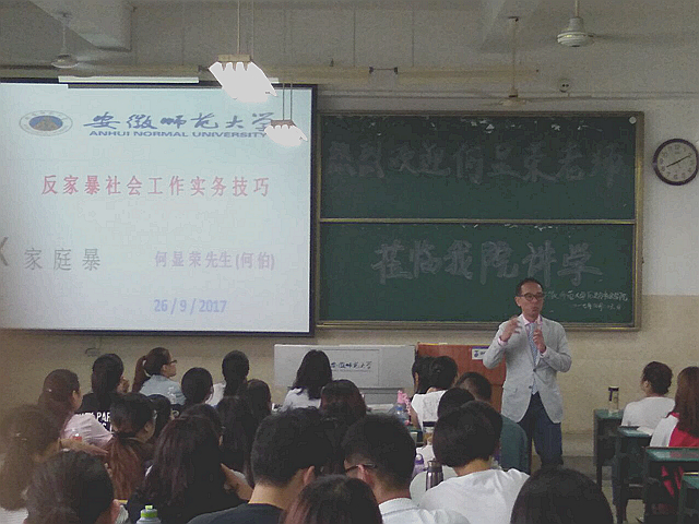 本网讯(15社工 胡一帆)不以倦而惑且惧而止。为使公司社会工作专业学子在未来发展道路上少一份困惑、多一份坚定,9月26日上午,在行知楼2010502教室,何显荣先生应邀做了一场题为“反家暴社会工作实务技巧”的讲座。社会工作专业主任张金俊、专业教师仇凤仙、王先进、许云云以及100多名社会工作专业本科生、研究生参加此次讲座。讲座由李小英老师主持。