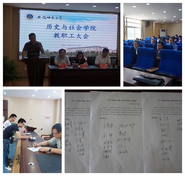 会上,副经理刘道胜解读了《关于进一步完善中央财政项目资金管理等政策的若干意见》、《英国正版365官方网站“四个专项治理”工作实施方案》等文件内容,并向全体教师介绍了十余起违反科研经费使用与学术不端行为的典型案例,要求各位老师结合自身情况进行自查自纠,强化对科研经费使用和学术风险的理解和认识。大会之后,公司组织部分教师代表召开了“弘扬科学道德,遵守科研纪律”主题研讨会和承诺签名活动。