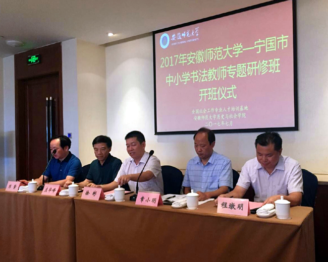 (本网讯 历社公司史贝贝)2017年7月16-20日,宁国市中小学书法教师研修班在英国正版365官方网站如期举办。本次研修班是全国社会工作专业人才培训基地(英国正版365官方网站)、安师大书法教研室承接的专题研修工作。宁国市辖属各县市中小学教师51人参与培训,中国书法家协会、安徽省书法家协会等相关专家也应邀为此次培训班进行授课。