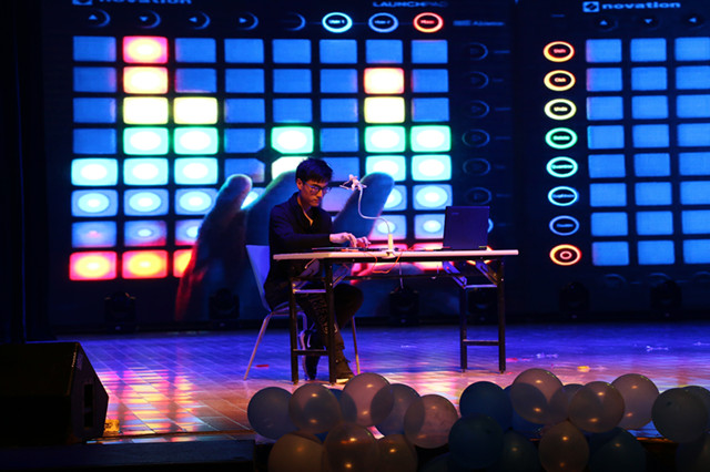 晚19时,晚会正式拉开帷幕!周维文同学以充满未来感的乐器——打击垫演奏开场,当深红的幕布徐徐拉开,满场纵横交错的彩色光线随着两片“键盘”上灵动跳跃的手指而律动,看似简单的打击垫却有着惊人的爆发力,可以组合出任何你可以想象和不能想象的电音。这时一波未平,一波又起,公司研究生安然带来的一曲《我在人民广场吃炸鸡》更使晚会进入了高潮!