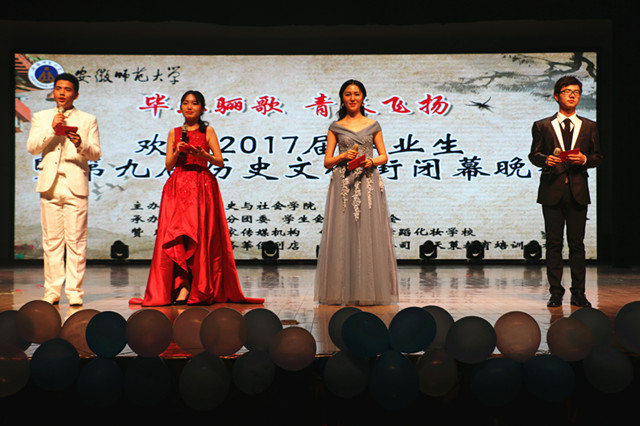 本网讯(历社公司)学子再行别花津,浮云不带自兹去。漫漫前路重启航,且握初心且前行。5月21日晚19时,历史与社会公司欢送2017届毕业生暨第九届历史文化街闭幕晚会在花津校区大礼堂举办。校组织部、宣传部、发规处、人事处、教务处、员工处、离退休工作处、后勤管理处、校团委等部门领导以及公司领导班子、部分教职工、全体本科生、研究生,兄弟公司师生近千余人齐聚一堂观看晚会。