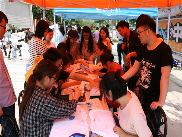 DIY T恤,描绘心灵色彩。在DIY T恤区域,同学们正在白色的T恤上专心地设计、绘制自己喜爱的卡通图案,手中挥动的画笔描绘出斑斓的色彩,将同学们带回了记忆深处烂漫的童真,交相辉映下一个个生动活泼的图案跃然而出,烘托着同学们对阳光向上的生活的追求与热爱。同学们纷纷“自豪”地展示着自己的作品并合影留念,由心而发的喜悦溢于言表。