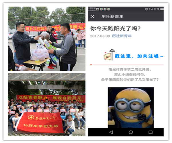此外,公司积极为各年级各专业分发体育器材,鼓励开展各种体育比赛。各专业经常开展趣味比赛,不仅丰富了同学们的日常生活,而且培养了同学们对体育的兴趣。一年级的全体同学,更是积极参加到“阳光体育”运动中,操场上、花津河畔、林荫大道上,总会出现历社学子的身影。