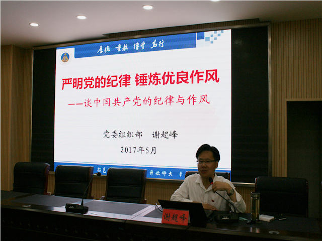 谢超峰副部长首先结合国产大飞机C919首飞无人问津的现状犀利指出现今社会舆论导向存在严重偏差,就这一问题的深入研讨,充分调动了学员的积极性,使在座的每一位同学迅速进入学习状态。谢部长依托典型事例,引经据典从“新形势下我党面临的挑战与考验”、“严明党的纪律,锤炼优良作风”、“维护党的纪律,传承优良作风”三个方面进行详细讲解。首先讲述了国内环境和国外环境对我党的挑战,借刘志军寻靠山石,魏鹏远小官巨贪的案件详细指出了贪腐这颗毒瘤对我党的不良影响,引发大家思考。其次谢超峰副部长讲述了我党在成立九十六年来所经历的风风雨雨,通过中国共产党的发展历史证明只有中国共产党才能领导中国人民取得民族独立,实现民族振兴、国家富强和人民幸福。随后,谢部长为学员们讲解了党纪相关内容,并充分强调党规党纪的重要性。在课程的最后谢超峰对广大入党积极分子提出三个问题:入党为什么?为党做什么?身后留什么?引发在座同学广泛讨论,他同时也希望党课班学员做到“五带头”(一)带头坚定信念(二)带头勤奋学习(三)带头全面发展(四)带头服务奉献(五)带头弘扬正气。谢超峰副部长深入浅出的授课方式,简明扼要的高度概括使党课班学员们受益匪浅。下课时同学们仍意犹未尽,掌声阵阵。
