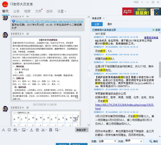 依托公司就业指导中心发布的招聘信息,各班在辅导员王建辉老师的具体指导下,通过梳理招聘集市的就业资讯,构建了以班级骨干为核心的班级就业联系网络,做到就业帮扶零距离、全覆盖。班级骨干作为就业联系网络的重要环节,及时有效地将就业讯息推送至同学手中并根据同学的反馈,总结归纳同学们的个性需求,反复推送、择优推送、定点推送,切实做到服务同学就业、督促同学就业。最重要的是,班级骨干充分利用班级就业联系网络,工作由表及里,扎实推进,在传递讯息的同时,倾听同学的心声,为同学们加油打气,在就业季这场攻坚战中,让广大同学们感受到暖暖的同窗情。