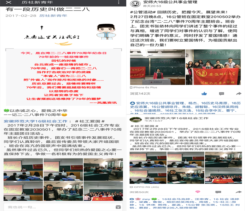 院团委充分利用院团委、员工会和各班的线上宣传平台,在微博、微信、QQ等同学们喜闻乐见的新媒体平台上互动交流,做到及时更新,宣传“二·二八”事件的历史真相。同学们纷纷表示:最近都被纪念“二·二八”事件的相关活动“刷屏”了,每次看到相关文章都热血沸腾,正是一次次的线上推送与更新,才让我们有机会走进历史、了解历史,还原历史真相。