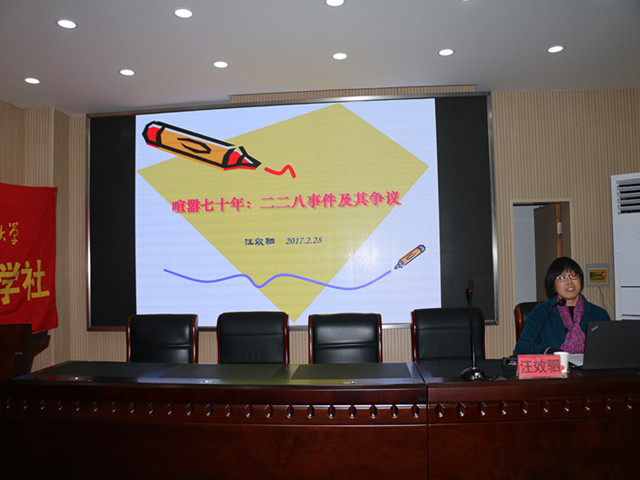 2月28日晚,院团委联合赭山史学社邀请中国近现代史研究专家汪效驷教授在院行政楼二楼报告厅举办了一场题为《喧嚣七十年,二·二八事件及其争议》的主题讲座。汪教授主要从“事件发生的背景与过程”、“国共两党对于事件的态度和定性”,“当今台独势力对于事件的利用”等三个方面进行讲述,她明确指出“二二八”事件是我国台湾省人民反独裁、反压迫、争取民主的群众运动,是中国人民解放斗争的一部分,与“台独”无关。同学们在台下认真倾听,不时做着记录。在最后的交流环节,汪教授告诫大家:“身为当代老员工一定要树立正确的是非观念,不要盲目跟风,被网络上一些虚假消息所误导。”