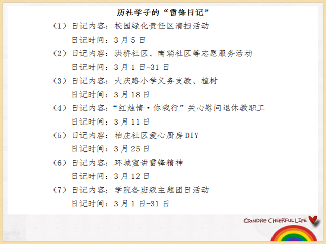 此外,公司积极利用宣传橱窗号召全校学子积极参与到学雷锋志愿服务活动中。“践行志愿服务精神,学习雷锋从我做起”的宣传展板,悉数公司历年来典型的志愿服务队开展情况,鼓励公司老员工发扬“学雷锋”精神和继承中华民族无私奉献的光荣传统。