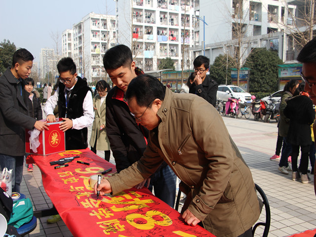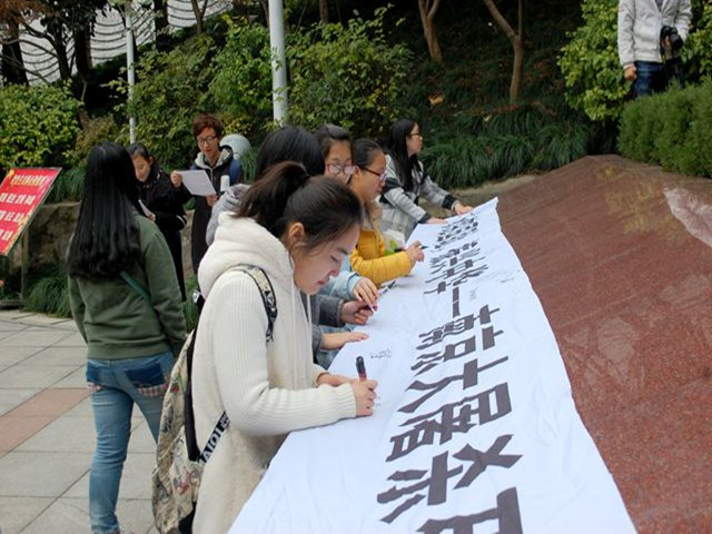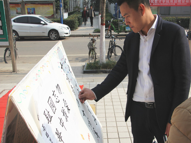 12月9日中午,院团委、员工会全体成员在二食堂门口举行了“纪念12·9运动81周年”主题宣讲活动,同学们通过在横幅上签名和参观自创的优秀爱国书法作品等活动,来缅怀那个激情燃烧的革命岁月。同学们一副副精美的书法作品、一首首激情的爱国诗歌,让许多师生久久驻足。公司党委副书记李琳琦也在横幅上郑重地签下姓名。