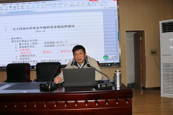 本网讯(历史与社会公司 刘丽)为帮助公司教师积极申报国家社科基金项目,进一步提升公司2017年国家社科基金项目申报数量和质量,12月14日下午,公司邀请了国家社科基金项目评审专家、博士生导师王世华教授做2017年国家社科基金项目申报辅导报告,报告会在公司二楼会议室举办,20余名教师参加了报告会,会议由公司副经理刘道胜教授主持。