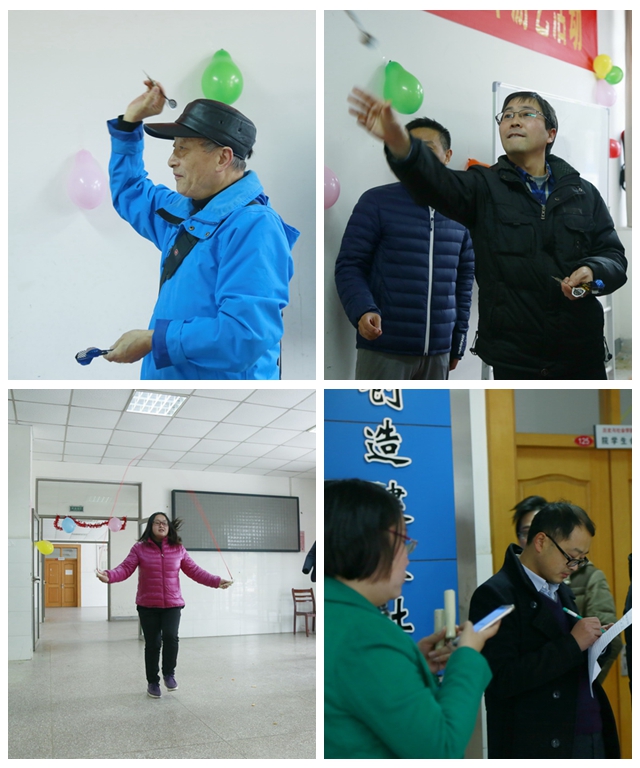 活动现场彩带招展、彩球飘扬,参会教职工兴致盎然,现场一片片欢声笑语。跳绳计时赛、投飞镖、贴鼻子、夹球进框,丰富的活动内容让大家尽情欢乐。