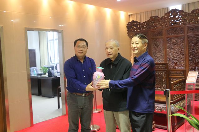 九十高龄的章开沅教授在近2个小时的参观中一直精神矍铄,步履矫健,他兴致盎然,认真观看每一件展品,一面听讲解,一面介绍他所记忆中旧时大户人家家具摆放的规矩,对我馆古典家具、唐三彩器、明清官窑瓷器等展出品质量之精、数量之多、展览布局之紧凑给予高度评价。他一再强调一所高校有自己的博物馆非常重要,它体现了安徽师大历史悠久、底蕴深厚,鼓励我们坚持下去,办出特色。参观结束后,张老挥毫为公司博物馆题词:“琳琅满目、国之瑰宝”。