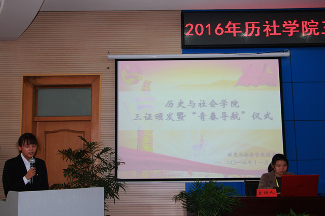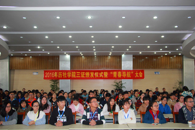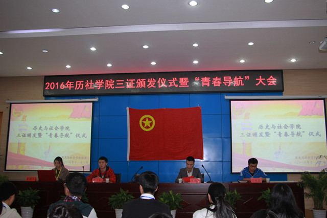 本网讯(院团委宣传部) 高举团旗跟党走,胸怀祖国做栋梁。为加强基层团组织建设,增强新生团员的意识,全面提高团员综合素质,进一步明确团员责任与义务,11月2日下午,历社公司团委在圆形报告厅二楼举办“2016级新生团员‘三证颁发’暨青春导航”活动。2016级辅导员、院员工会指导老师周贤超,院社团指导老师王雨兵,院团委员工副书记楚子轩,院员工会主席吕永鑫及公司2016级全体新生团员参加了此次活动。