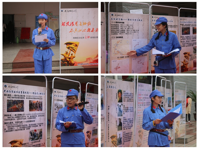 (本网讯 杨玉城 盛雨馨)雄风漫卷长征路,不忘初心向未来。2016年是长征胜利的第80周年,为引导广大师生深刻了解长征历史,继承和弘扬长征精神,10月13日,历社公司分党校2016入党积极分子学员、15级历史学专业同学们,在二食堂前广场举办纪念长征胜利80周年活动。员工工作处处长台启权老师、校团委书记梁燕老师,以及员工工作处各位老师莅临现场。历社公司党委副书记胡悦超,院团委书记宫超及15级辅导员金捷参加并指导此次活动。