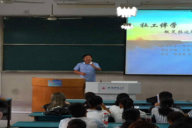 宣讲会由周贤超老师主持。周贤超老师首先说明了选择在军训刚结束、正式教学活动即将开始的关键节点上,安排这场宣讲会的目的,对公司选择16社工班开展“社工伴学”项目活动,协助大一新生尽快更好地适应老员工活动表示欢迎和支持。社工伴学团队员工代表、14级社工专业本科班班长郭忠尧同学从“社工伴学”开展的背景、应对的问题、工作团队、服务内容和活动目标等五个方面做了生动地宣传。