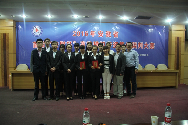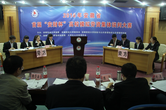 全国高校模拟劳资集体谈判大赛是公共管理学科的专业品牌竞赛,由中国人力资源开发研究会主办,自2012年第一届全国竞赛举办以来,每届大赛均吸引了国内几十所重点高校的积极参与。2016年安徽赛区比赛在安徽财经大学举行,赛前四个月,公司公共事业管理专业收到大赛通知。在公共事业管理教研室主任安建增的大力支持下,14公管专业员工曹慧、康咪、朱园园、彭梦青、陈思潮、韩露瑶、苑珑睿、王悦、龙家壮成立了劳资两支代表队,同时,为了优化团队结构,还吸纳了14社会盛雨嘉、15公管杨文俊、15历史朵金峰3名同学加入,并针对团队认真进行了前期磨合。安建增、孔卫拿两位老师多次前往首都经济贸易大学、安徽财经大学等高校进行取经,了解和熟悉大赛相关事宜。