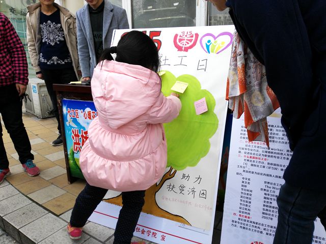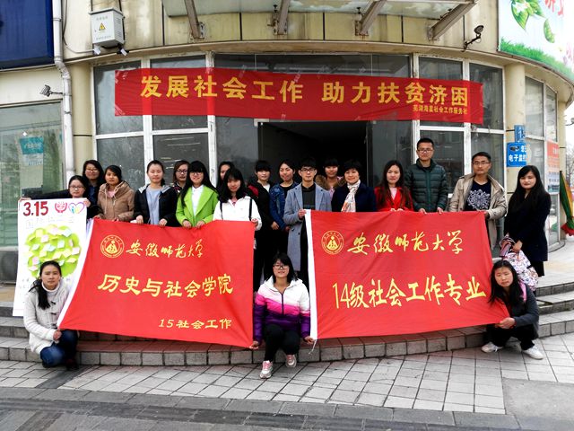 3月15日上午,在安徽首届十大民间公益人物、社会工作专业教师柴文杰老师的带领下,2014级、2015级社工员工与芜湖海星社会工作服务社一起,前往弋江区洪桥社区,举办主题为“发展社会工作,助力扶贫济困”的社区宣讲活动。活动中,同学们利用精心制作的海报、传单等宣传品,主动向社区居民介绍社会工作专业“助人自助”的理念、传播“扶贫济困”的思想,帮助居民了解社会工作,接纳社会工作,引导更多的人参与到社会工作中去。
