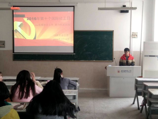 3月14日晚,公司2014级、2015级社会工作专业召开“第10个国际社工日”主题班会,介绍国际社工日的由来,它是国际社会工作者联盟(IFSW)组织主席大卫·琼斯博士倡导发起的;阐明该项活动发起的目的是为社区内弱势人群解决问题,为有需要的人士贡献自己的爱心、知识和技巧;强调作为一名社会工作者,是应该值得骄傲的,不仅在于它的职业特性,更在于职业使命。社工专业的员工纷纷上台发言,表达自身对社会工作专业的认识、对“自助助人”理念的理解等。通过这次班会,同学们对于社会工作的认同感和专业的荣誉感有了增强,对自己的专业发展更有信心,在成为一名合格的社会工作者的道路上更加坚定了信心。