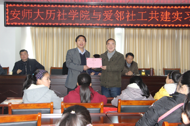 本网讯(历社公司 王杰) 2016年3月12日上午,历史与社会公司和芜湖市弋江区爱邻社会工作服务中心共建实习基地授牌仪式、课程合作开发签约仪式、机构督导聘任仪式在马塘街道松韵园社区举行。芜湖市社工(者)协会杨前华会长、公司赵怀娟副经理和王杰老师、爱邻社工服务中心周声伍主任及松韵园社区党委领导、马塘小学领导出席了授牌仪式。