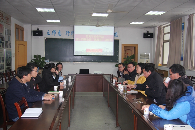 (本网讯 金捷)2015年12月30日上午,历史与社会公司在院行政楼二楼会议室召开全国第十四届“挑战杯”参赛总结大会。公司党委书记王如意,校图书馆馆长方青教授,团队指导教师赵怀娟教授、陈爱如副教授,专业主任安建增副教授,团委书记宫超、15级本科生辅导员金捷及挑战杯国赛获奖员工王婷、宋一墨等人参加了此次总结大会。会议由公司党委副书记胡悦超主持。