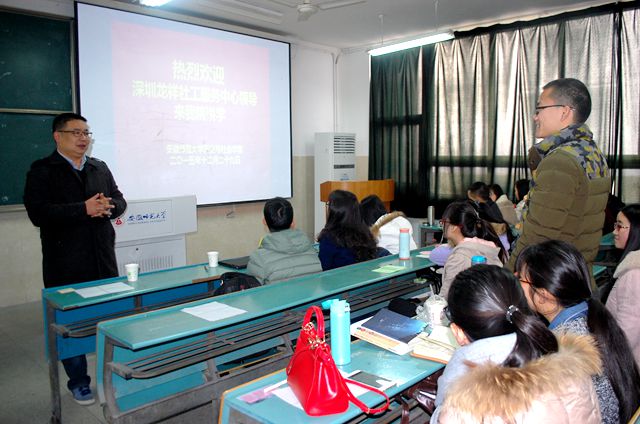 本网讯(院员工会 万娟)2015年12月29日上午,深圳龙祥社会工作服务中心总干事彭东强一行四人来公司讲学。公司党委副书记胡悦超、副经理刘道胜、社会工作专业负责人张金俊及社会工作专业师生100多人到场观摩聆听。